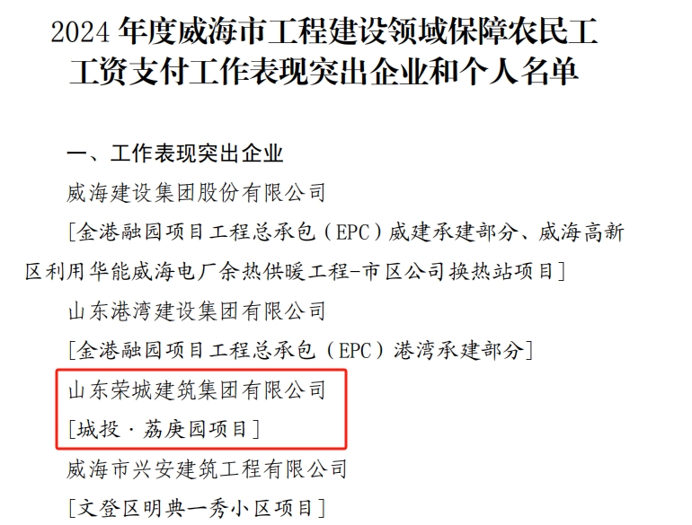 我司城投?荔庚園項(xiàng)目榮獲2024年度威海市工程建設(shè)領(lǐng)域保障農(nóng)民工工資支付工作表彰